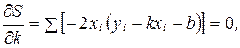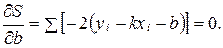 была минимальной (отсюда и название – метод наименьших квадратов). Для определения значений k и b, при которых величина S минимальна, приравниваем к нулю частные производные от S по k и b: