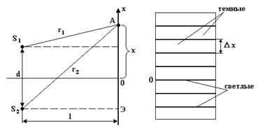 Пусть S 1 и S 2 – когерентные (щелевые) источники света, расположенные на расстоянии d друг от друга, экран Э расположен параллельно d на расстоянии l (l >> d). Световые волны от S 1 и S 2, накладываясь в точке А экрана друг на друга, интерферируют, окрашивая экран прямолинейными полосами (светлыми и темными). Так как световые векторы определяются уравнениями