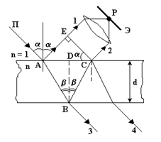 Волны 1, 2, 3, 4 образуются из одного падающего луча П и являются когерентными. Лучи 1 и 2 называют отраженным светом, лучи 3 и 4 – проходящим светом.