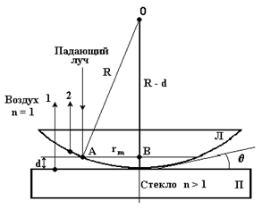 Одним из характерных примеров полос равной толщины являются кольца Ньютона, наблюдающиеся при отражении света от воздушного зазора, образованного плоскопараллельной стеклянной пластинкой П и соприкасающейся с ней плосковыпуклой линзой Л с большим радиусом кривизны (см. рис. 13).