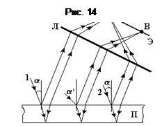 В пучке рассеянного света имеются лучи всевозможных направлений (см. рис.14). Лучи 1 и 2, лежащие в одной плоскости и падающие на пленку П под одним и тем же углом a, сфокусируются линзой Л в одной и той же точке А, лежащей в фокальной плоскости линзы (на экране Э). Лучи, падающие под тем же углом a, но лежащие в другой плоскости, соберутся в другой точке фокальной плоскости. Лучи, падающие на пленку под другим углом a¢, соберутся в других точках. Таким образом, на экране возникнут светлые и темные полосы (кривые), соответствующие максимумам и минимумам интенсивностей света, падающего под определенным углом на пленку.