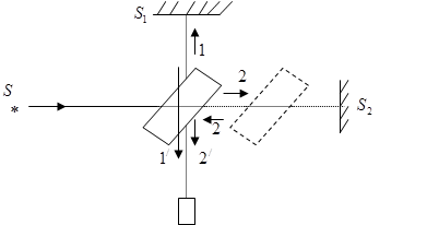 Приведем схематическое описание интерферометра Майкельсона. Параллельный пучок лучей от источника S падает под углом