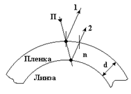 никновению бликов, что (например, в военном деле) демаскирует положение наблюдателей. Для устранения указанных недостатков на поверхности линз наносят тонкие пленки с малым коэффициентом отражения и показателем преломления меньшим, чем у материала линзы (n пл < n л)