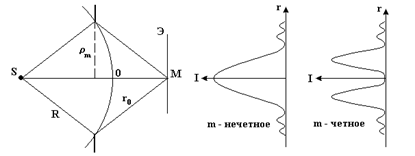 Пусть сферическая волна падает на непрозрачный экран с круглым отверстием, в которое укладывается m зон Френеля (см. рис. 20).