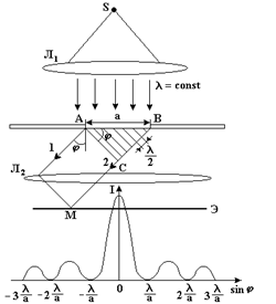 Пусть точечный источник света помещен в фокусе S собирающей линзы Л1 (см. рис. 21). На выходе из линзы лучи будут параллельны. Плоская монохроматическая волна падает нормально на экран со щелью шириной а (длина щели