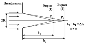 l0 = 600 нм нормально падает на диафрагму с круглым отверстием радиусом R = 0,6 мм. В центре экрана, расположенного на расстоянии b 1 = 18 см от диафрагмы, наблюдается темное пятно.