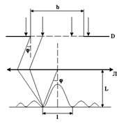 Заметим: при заданных размерах щели b и расстоянии от линзы до экрана L ширина центрального максимума l тем меньше, чем меньше длина волны l0 монохроматического света.