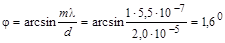 Задача 4. Определить угол отклонения j лучей зеленого света (l = 0,55 мкм) в спектре первого порядка, полученном с помощью дифракционной решетки, период которой d = 0,020 мм.