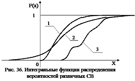 Интегральная функция распределения вероятностей широко применяется для задания законов распределения различных СВ, но имеет один недостаток. Этим недостатком является невысокая наглядность. Если изобразить графики (1, 2, 3) интегральной функции нескольких непрерывных СВ в одних осях (рис. 36), то их нетрудно отличить друг от друга.