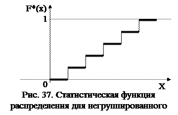 Если случайная величина дискретна и количество наблюдавшихся значений (вариант) невелико, то статистическая функция распределения вычисляется на основе негруппированного статистического ряда и внешне не отличается от функции распределения дискретной СВ (рис. 37). Её принципиальным отличием от теоретической функции является учёт не теоретических вероятностей, а относительных частот наблюдения отдельных значений СВ (этим частотам равны высоты «ступенек» графика). Например, статистическая функция распределения оценок студентов на экзамене строится на основе ограниченного (не бесконечного) количества экзаменационных ведомостей.