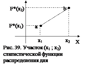 Каждый участок (a;b) ломаной (рис. 39) соответствует интервалу (разряду) статистического ряда и представляет собой отрезок прямой, что характерно для равномерного закона распределения случайной величины внутри интервала (х1;х2).