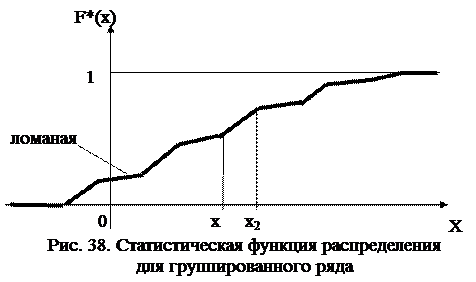 Если статистическая функция распределения строится на основе группированного статистического ряда (он используется в тех случаях, когда количество вариант велико), то она представляет из себя ломаную линию (рис. 38).