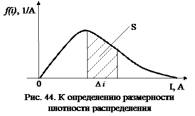 Площадь под кривой распределения (рис. 44) по своему вероятностному смыслу является вероятностью. Как и всякая вероятность, эта площадь безразмерна. С другой стороны площадь есть произведение длин отрезков по осям абсцисс и ординат, т.е. по размерностям – произведение размерности СВ на размерность плотности распределения. Так, если случайной величиной является ток, измеряемый в амперах, то плотность распределения должна измеряться в 1/А – тогда произведение размерностей А ∙ 1/А даст безразмерную величину.
