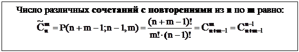 Сочетания с повторениями отличаются составом элементов, входящих в выбираемое множество. Порядок элементов не имеет значения. Имеет значение, сколько элементов каждого типа вошло в сочетание.Рассмотрим определенное сочетание.