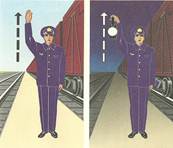 - требование машинисту произвести пробное торможение (после устного предупреждения): днем - поднятой вертикально рукой; ночью - поднятым ручным фонарем с прозрачно-белым огнем (рис. 4.5). Машинист отвечает одним коротким свистком локомотива и приступает к торможению;