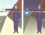 - требование машинисту отпустить тормоза: днем - движениями руки перед собой по горизонтальной линии, ночью - такими же движениями ручного фонаря с прозрачно-белым огнем (рис. 4.6). Машинист отвечает двумя короткими свистками локомотива и отпускает тормоза.