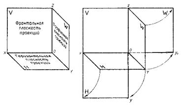 Комплексный чертеж – это чертеж, на котором построены три проекции точки (горизонтальная, фронтальная и профильная). При этом горизонтальная и профильная плоскости проекции развернуты и совмещены с фронтальной плоскостью (рис. 3.2 б). Проекции на плоскости H, V, W строятся по координатам, которые откладываются по осям, между которыми заключена соответствующая плоскость: