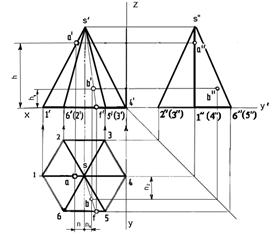 1) Координаты y точек 1, 2, 3, 4, 5, 6 (рис. 4.4, а) и вершины – точки s – переносим с помощью линий связи с горизонтальной проекции на профильную проекцию.
