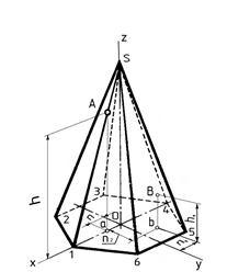6) Из вершин шестиугольника основания проводим прямые, параллельные соответственно осям х, у или z. (рис. 4.2 б). На этих прямых от вершин основания отложим высоту призмы и получим точки 1, 2, 3, 4, 5, 6 вершин другого основания призмы.