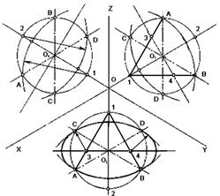 3) От точки О отложим на оси х расстояние n1, а на оси у расстояние n2, взятые с комплексного чертежа, рис. 3.5, получим точку в.
