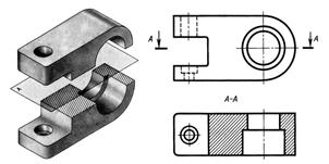 Горизонтальный разрез – выполняется секущей плоскостью, параллельной горизонтальной плоскости проекции. Верхняя часть детали мысленно удаляется, а оставшаяся нижняя часть проецируется на горизонтальную плоскость проекции (рис. 5.6).