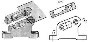 Фронтальный разрез - выполняется секущей плоскостью, параллельной фронтальной плоскости проекций (рис. 5.5, а). Часть детали, расположенная перед секущей плоскостью, мысленно удаляется, а оставшаяся часть, полностью изображается на месте главного вида. Все контурные линии, расположенные в секущей плоскости и за ней, показывают на разрезе как видимые.