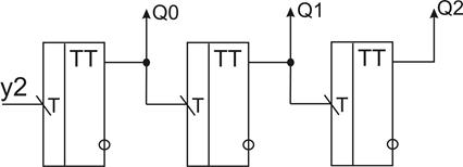 В качестве базового триггера возьмем Т-триггер с динамическим Т-входом, такой триггер получается при модификации двухступенчатого JK-триггера, со срабатыванием по срезу синхроимпульса. Таким образом, Т-триггер с динамическим Т-входом тоже срабатывает по срезу синхроимпульсов. Назовем синхроимпульс счетным импульсом и обозначим y2.