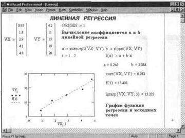 Другой широко распространенной задачей обработки данных является представление их совокупности некоторой функцией у(х). Задача регрессии заключается в получении параметров этой функции такими, чтобы функция приближала облако исходных точек (заданных векторами VX и VY) с наименьшей среднеквадратичной погрешностью. Чаще всего используется линейная регрессия, при которой функция у(х) имеет вид: у(х)=а+ вх и описывает отрезок прямой. К линейной регрессии можно свести многие виды нелинейной регрессии при двупараметрических зависимостях у(х).