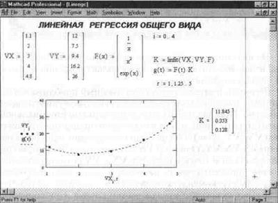 В MathCAD реализована возможность выполнения линейной регрессии общего вида. При ней заданная совокупность точек приближается функцией вида
