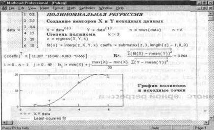 Введена в новую версию MathCAD и функция для обеспечения полиномиальной регрессии при произвольной степени полинома регрессии regress(VX,VY, n)