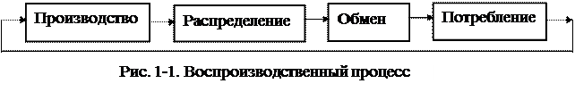 Если процесс производства рассматривать как непрерывно возобновляющийся процесс, включающий в себя четыре последовательных фазы: производство, распределение обмен и потребление, то это воспроизводство, (см. рис. 1-1).