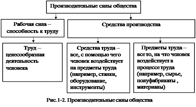 Различают простое и расширенное воспроизводство. Простое воспроизводство – это процесс, при котором воспроизводство возобновляется в неизменных размерах. Расширенное воспроизводство – это возобновление производства во все увеличивающихся размерах. В каждой из фаз общественного производства возникают определенные взаимосвязанные экономические отношения. Эти отношения образуют совокупное единство всех сторон производственных отношений. Это понятие неразрывно с понятием производительные силы общества (см. рис. 1-2).