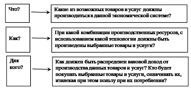 2) по способу, посредством которого координируется и управляется хозяйственная деятельность, решаются три основных вопроса экономики: Что? Как? и Для кого производить? Содержание этих вопросов показано на рисунке 1-5.
