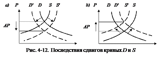 При увеличении предложения (кривая S сдвинется вправо-вниз) и при уменьшении спроса (кривая D сдвинется влево-вниз) цена снижается, см. рисунок 4-12 a), а при сдвиге кривых в противоположную сторону цена повысится, см. рисунок 4-12 b).