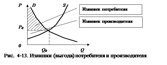 В экономическом анализе важное место отводится понятию излишек (см. рисунок 4-13). Так излишек потребителя представляет экономию для потребителя, а излишек производителя – дополнительную прибыль для продавца.