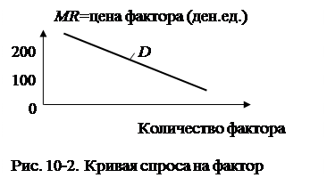 Кривая значений MR при изменении количества фактора, по существу, - кривая спроса на данный фактор отдельной фирмы, см. рис. 10-2. Кривая имеет отрицательный наклон (в соответствие закону убывающей предельной отдачи).