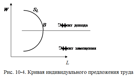 До определенного предела (точка В) рост заработной платы стимулирует работника к дополнительным затратам своего времени на труд. Добившись определенного уровня благосостояния, работник отказывается от дополнительной работы ради увеличения часов досуга. Эффект замещения сменяется эффектом дохода.