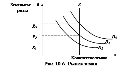 Ограниченность земли, невоспроизводимость ряда компонентов и неподвижность обусловили фиксированный характер предложения. Следовательно, предложение земли абсолютно неэластично или малоэластично и цена услуг земли (рента) всецело определяется спросом на землю, как показано на рис. 10-6.