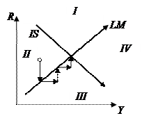 Направления приспособления экономики и движения ее к равновесию показаны стрелками. Если на товарном рынке существует избыточное предложение товаров, запасы фирм будут увеличиваться, а величина выпуска (дохода) Y уменьшаться (горизонтальные стрелки влево в областях I и IV по направлению к кривой IS). При избыточном спросе на товары запасы фирм сокращаются, а выпуск увеличивается (горизонтальные стрелки вправо в областях II и III по направлению к кривой IS). Когда на денежном рынке наблюдается избыточное предложение денег, люди покупают облигации, спрос на которые растет и поэтому цена которых повышается, что ведет (в силу обратной зависимости между ценой облигации и ставкой процента в соответствии с теорией предпочтения ликвидности) к снижению ставки процента (вертикальные стрелки вниз по направлению к кривой LM в областях I и II). При избыточном спросе на деньги, наоборот, люди начнут продавать облигации, чтобы получить в обмен наличные деньги в условиях их нехватки, что приведет к росту предложения облигаций, снижению их цены и соответственно к росту ставки процента (вертикальные стрелки вниз по направлению к кривой LM в областях III и IV). Следует иметь в виду, что восстановление равновесия происходит более быстро на денежном рынке, так как для этого достаточно изменить структуру портфеля активов, что не требует значительных затрат времени, в то время как для изменения величины выпуска требуется достаточно продолжительное время.