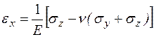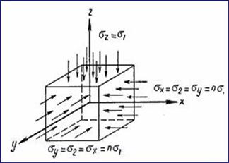 Выделим элементарный объем горной породы (рис.). Относительная деформация, которую это тело получило бы, например, вдоль оси х при сжатии его тремя взаимно-перпендикулярными, равномерно распределенными силами, выраженными главными напряжениями (