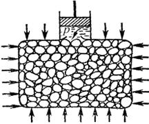 Представим себе элемент породы (рис.1.5), заключенный в непроницаемую эластичную оболочку и испытывающий горное давление с, а в порах пласта, насыщенного жидкостью,— давление р. До начала эксплуатации залежи пластовое давление жидкости способствует уменьшению нагрузки, передающейся на скелет породы от массы вышележащих отложений (если кровля пласта непроницаема). Тогда давление на скелет породы (эффективное давление)
