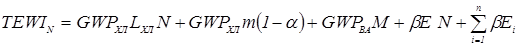 TEWIN - Полный Эквивалент Глобального Потепления, кгСО2; TEWIР - эмиссия СО2 от рационально использованной энергии на производство холода, кгСО2; TEWIQ - эмиссия СО2 от части энергии, преобразованной в холод, кгСО2; TEWIП - эмиссия СО2 от энергии, затраченной на охлаждение продуктов (от полезно затраченной части эксергии), кгСО2; D TEWIPВНЕШ - косвенный вклад в TEWIN от внешней необратимости процессов в холодильном оборудовании, кгСО2; D TEWIPВНУТ - косвенный вклад в TEWIN от внутренней необратимости процессов в холодильном оборудовании, кгСО2; D TEWIQ - эмиссия СО2 от нерационально использованной энергии, затраченной на охлаждение внутрикамерного оборудования, и компенсации теплопритоков в холодильную камеру, кгСО2; D TEWIЭ - вклад в TEWIN от эмиссии хладагента, вспенивающих агентов теплоизоляции и затрат энергии для получения конструкционных материалов и изготовление холодильного оборудования, кгСО2; D TEWIЭП - прямой вклад в TEWIN от эмиссии хладагента и вспенивающих агентов теплоизоляции, кгСО2; D TEWIЭК - косвенный вклад в TEWIN от затрат энергии на получение конструкционных материалов, изготовление оборудования, реновацию, обеспечение мер пожаробезопасности, кгСО2; D TEWIВСП - вклад в TEWIN от эксплуатации вспомогательного оборудования (насосы, вентиляторы), кгСО2; D TEWIS - вклад в TEWIN от нерационально использованной энергии при производстве холода, кгСО2.