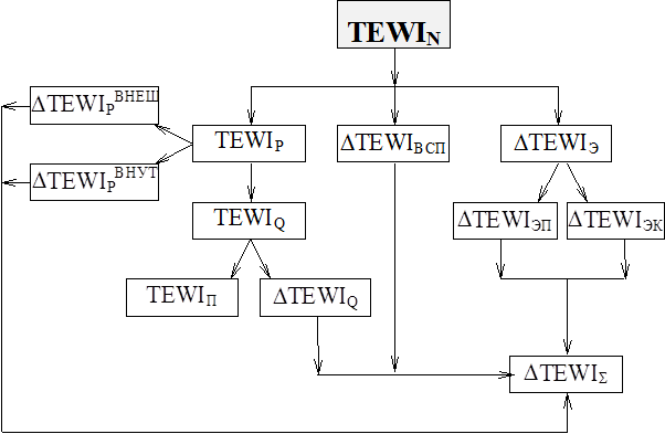 Конечной целью различных вариантов термоэкономического анализа является расчет величины общего эксергетического коэффициента (9.20), однако он количественно не отражает эффекта антропогенной нагрузки на природу от эксплуатации оборудования. Тем не менее, потери эксергии, в отличие от холодопроизводительности Q0, могут быть преобразованы в эквивалентную эмиссию СО2. Следовательно, если интегрировать полученные в рамках термоэкономического метода потери энергии в балансовую структуру TEWIN можно, с одной стороны, оценить экологическую нагрузку на природу, а с другой - получить ряд новых эколого-энергетических коэффициентов, отражающих эффективность использованной энергии. С этой целью рассмотрим балансовую схему вкладов TEWIN, которая показана на рисунке 10.9.