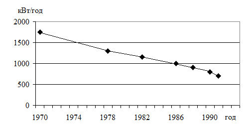 Однако следует отметить и тенденцию устойчивого повышения энергетической эффективности холодильного оборудования. Так, например, домашний холодильник объемом 570 л в 1972 г. в среднем потреблял 1750 кВт/год, а к 1993 г. его энергопотребление составляло уже 700 кВт/год, т. е. снизилось на 60%. По другим данным, энергопотребление европейских холодильников к середине 1990-х гг. по сравнению с моделями 1977 г. снизилось на 52-65%, а у морозильников на 46%. Для примера на рис. 10.11 приведено снижение энергопотребления бытовым холодильником в течение последних лет [3]. В работе [3] отмечается, что в соответствии с новыми стандартами, энергопотребление бытовых холодильных приборов снизится еще больше и будет равно энергопотреблению 60 ваттной лампы. Энергоэффективность кондиционеров с 1975 г. до 1995 г. повысилась на 35 % [3]. Энергопотребление агрегатированных холодильных машин (чиллеров) с 1978 г. по 1998 г. снизилось на 33% [3]. Такое улучшение энергоэффективности связано, прежде всего, с усовершенствованием ряда деталей холодильных машин. Однако основной причиной такого повышения энергоэффективности холодильного оборудования является вводимые правительствами стандарты и рыночная конкуренция