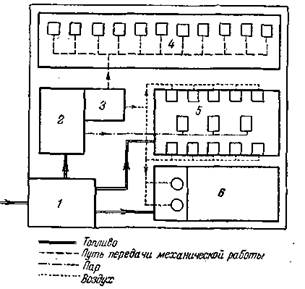Энергоснабжение предприятия осуществляется путем подвоза носителя энергии − топлива на топливный склад 1, затем в котельную 2, кузнечный цех 5 (для горнов) и в литейный цех 6 для плавильных печей. Пар из котельной идет в машинное отделение 3, а также на питание паровых молотов в кузнечном цехе 5. Механическая работа паросиловой установки передается через систему трансмиссий станкам 4 и приводит в действие воздуходувное устройство для снабжения сжатым воздухом горнов и плавильных печей. Представленная схема показывает техническое решение, остававшееся наилучшим в течение длительного времени. Позднее, к 80-м годам XIXв, эта схема перестала удовлетворять потребности растущего производства и была заменена новой.
