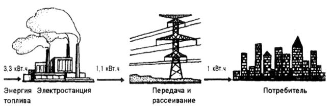 При этом следует иметь в виду достаточно низкий КПД электростанций и потери энергии при транспортировке (см. рис. 4.8).