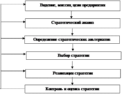Общая схема процесса стратегического планирования представлена на рис.3. стрелки в левой части схемы говорят об обратной связи и возможности внесений изменений в целевые ориентиры деятельности фирмы, доработки новой стратегии, внесения изменений в механизм реализации стратегии с учетом контроля и оценки результатов реализации стратегии.