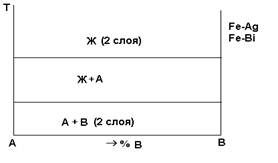 Диаграммы состояния с отсутствием и слабым взаимодействием между элементами. При отсутствии между элементами А и В химической связи они не образуют между собой сплавов ни в твёрдом, ни в жидком состоянии (рис. 2).