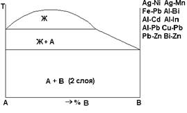 При образовании между паяемым металлом А и припоем В диаграммы состояния с монотектикой степень их физико-химического взаимодействия ещё весьма невелика и взаимодействие между паяемым металлом и припоем может быть слабым (рис.3).