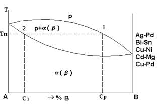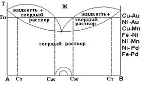Элементы Cu-Au, Au-Ni, Cu-Mn Fe-Pd, Fe-Ni, Ni-Mn, Ni-Pd образуют систему с непрерывным рядом твердых растворов с минимумом на кривой ликвидус (рис.8).